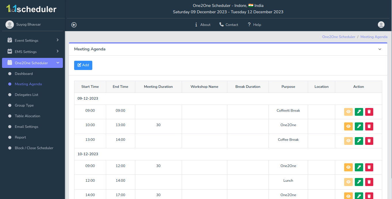 Once you logged into the one2one scheduler system by using your "Login E-mail" and "Access code", you will be presented with "Schedule Your Meetings" page by default. You can schedule your meetings in two ways: